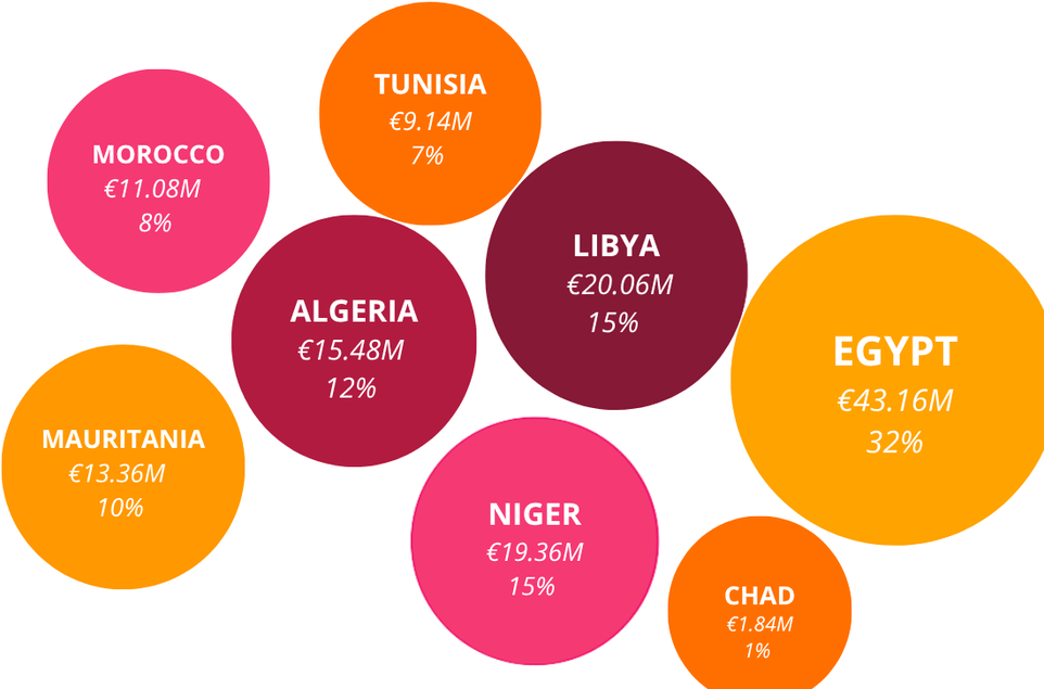 Since 2016, the RDPP NA has funded 95 projects in Algeria, Chad, Egypt, Libya, Mauritania, Morocco, Niger, Tunisia, with a total amount of 141,9 million euros (120 million funded by EU AMIF funds and 21.9 million funded by Italy, Czech Republic, Norway, Austria and Netherlands).